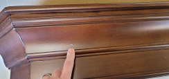 Mantel has some very small blemishes to the front face and one small nick. Blemishes and nick can be covered up with touch-up staining.