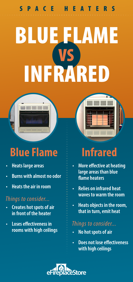 The result is a very even heat without pockets of hot air near the heater. Another bonus is that the heat is not affected by air movement, so these heaters work for high ceilings. They also radiate heat farther than blue flame heaters and are more effective in large rooms.