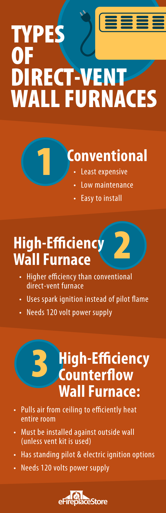 A direct-vent wall furnace mounts to the wall of the home and function as a direct vent fireplace. The venting system consists of one pipe nestled within a larger pipe. The inner pipe carries exhaust gases outside and the outer pipe draws air in.