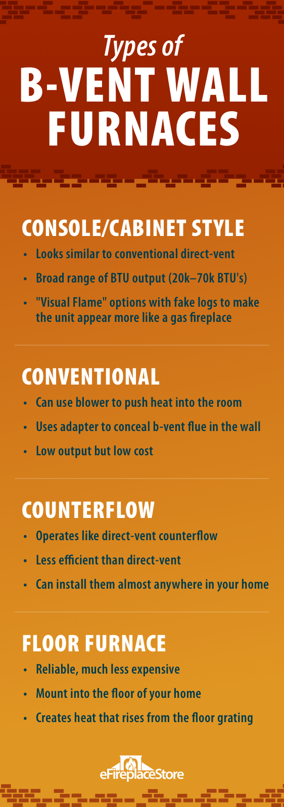 They are also available in high outputs and can serve as a primary heat source for smaller homes. There are several types of b-vent models: